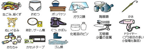 ごみ分別についての紹介ページです。可燃ごみとリサイクルできないビン、陶器類、少量の金属を含むごみは、、一般ごみとして指定ごみ袋に入れてください※ガラス、刃物等は新聞用紙に包む等、危険のないように出して...